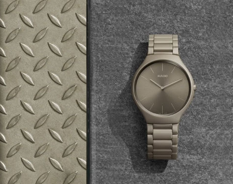 - L'une d'elles est dotée d'un boîtier monobloc et d'une couronne en céramique haute technologie gris fer mat. Son verre saphir dévoile un cadran brossé soleil gris fer, orné d'index et d'aiguilles imprimés vert anglais légèrement grisé, ainsi que du logo Rado. Elle est montée sur un bracelet en céramique haute technologie gris fer mat, avec des maillons intermédiaires en céramique vert anglais légèrement grisé, et une boucle déployante en titane avec revêtement PVD.